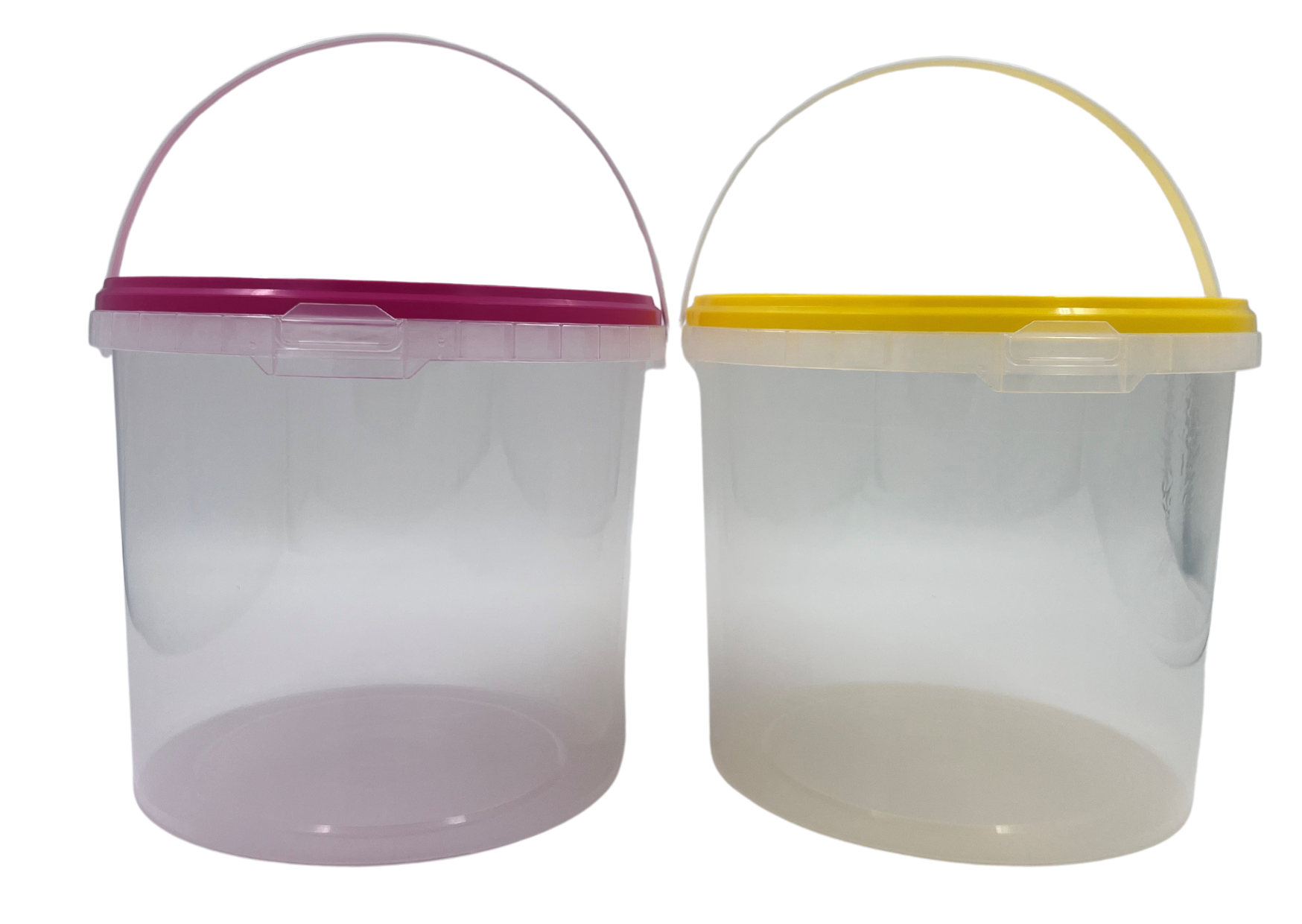 Discover our versatile Buckets Transparent with Lid, available in various sizes! These practical buckets are perfect for storing all your treats, such as baked popcorn and candyfloss. The transparent design keeps the contents visible, allowing customers to see what's inside at a glance. Each bucket features a sturdy white handle and a locking seal lid, ensuring a secure and reliable seal. The lids come with a combination of pink and yellow lids.Size 1.0 Liter: Diameter top 137 mm, Height with lid 109 mmSize 1.5 Liter: Diameter top 147 mm, Height with lid 133 mmSize 3.0 Liter: Diameter top 200 mm, Height with lid 138 mmSize 5.0 Liter: Diameter top 225 mm, Height with lid 197 mmSize 10 Liter: Diameter top 267 mm, Height with lid 264 mmSize 20 Liter: Diameter top 326 mm, Height with lid 352 mm PlasticThe bucket and lid are made of 100% recyclable Polypropylene (PP).